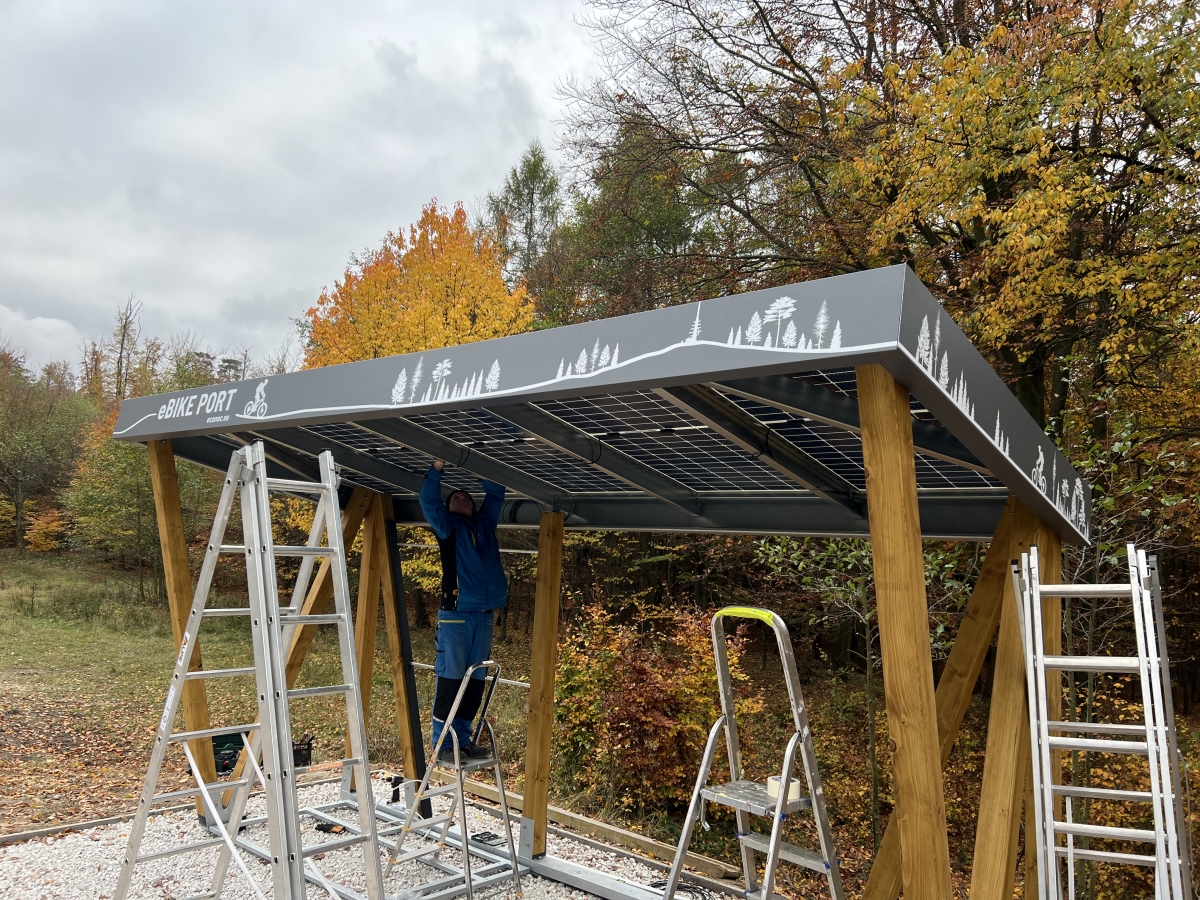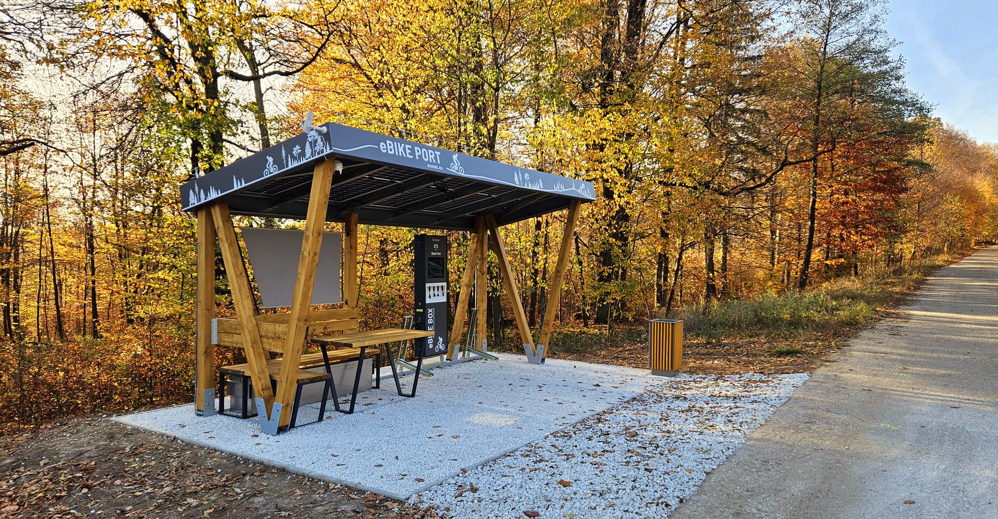 Solárny cykloprístrešok s nabíjacou stanicou pre elektrobicykle